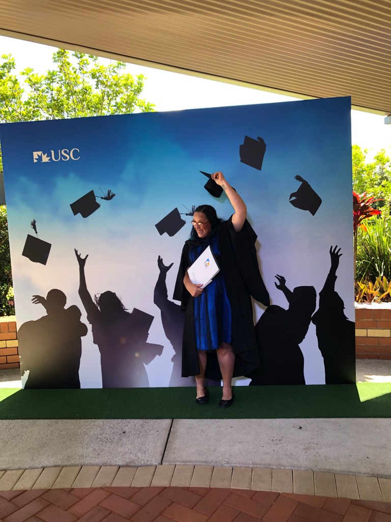 I did not attend uni for a long time. The minute I realised that my new husband was the real deal and this was an area suitable for growth, healing and achieving mutual goals together, I reenrolled into uni. My first semester back, I did one course just to test the water. I did so well, I topped the class and won a green pen and an umbrella. I was even invited to do a service learning project auditing rural fire brigades. After that, I gave my all to uni and my then fiancé cooked, cleaned and worked to get me through to graduation. I had gotten to a point in my last year that I was giving academic advice to my student peers alongside academic professionals.