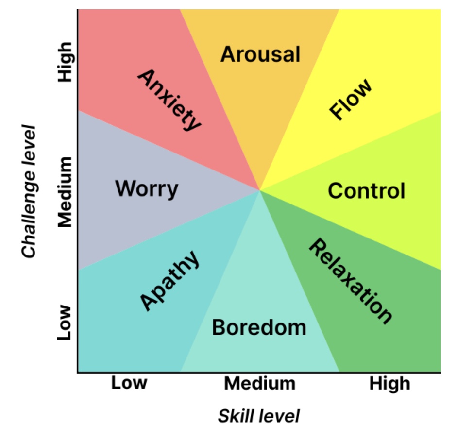 One will experience “flow” when high levels of challenge in the task and skill at the task are hand in hand. I think most things, I sit in a natural state of anxiety, arousal, control, and relaxation, missing out commonly on the elusive “flow”.