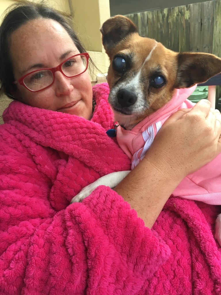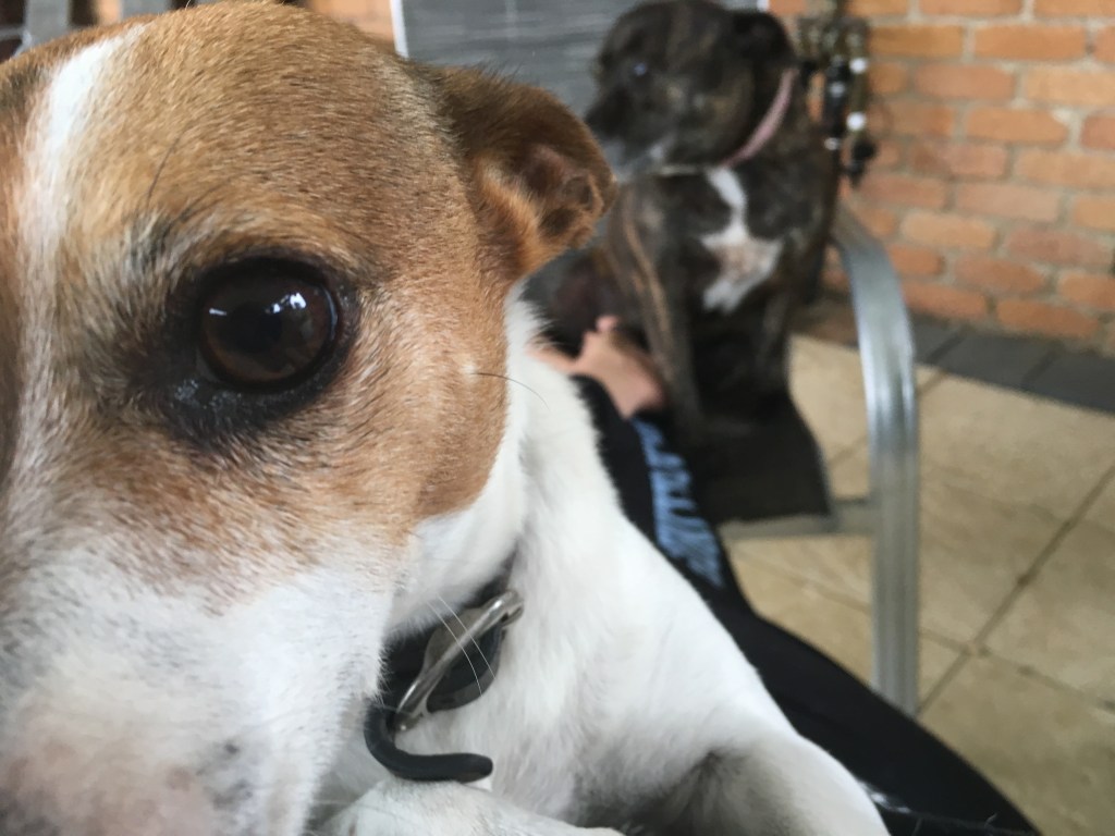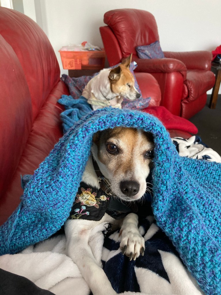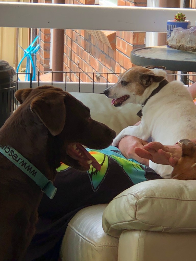 She was rescued from a puppy farm and Shelley and Lola have become her puppies as she was ripped away from three litters before she was three years old. Must have been devastating for her. She is very anxious and loves to lick everyone. She needs a lot of love and some obedience training but we are happy to give her a forever home. She’s obsessed with me so I’m pretty sure she’s my dog even though hubby wanted her.