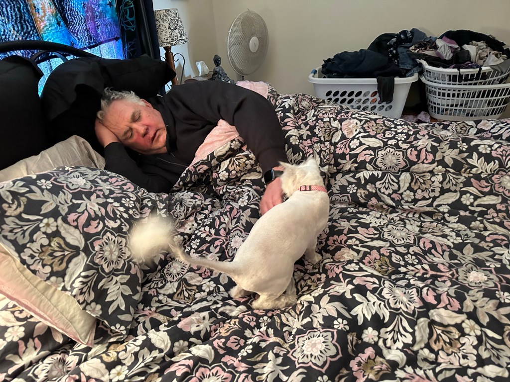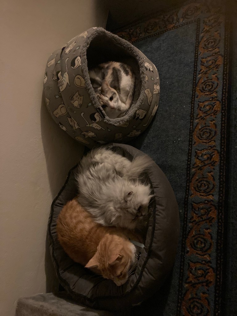 Luna is a bit skittish to this day but has just started to trust hubby during his cancer treatment as he’s been home and in bed a lot. She likes our bed and loves to snuggle in the warmth with him.