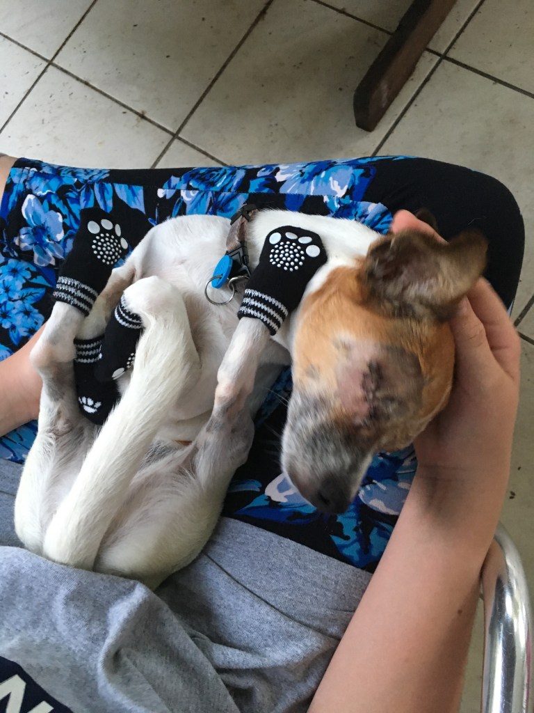 We got a mobile groomer around and got her shaved to remove the dreadlocks she’d developed and worked on getting her to trust us.