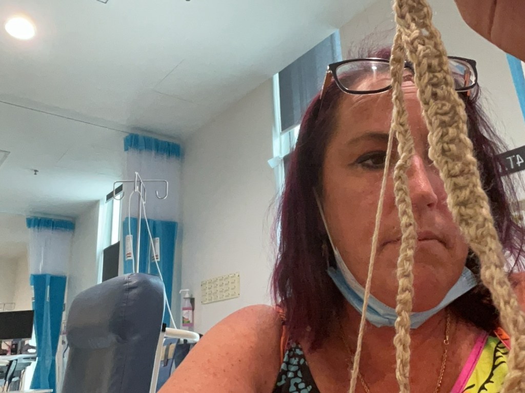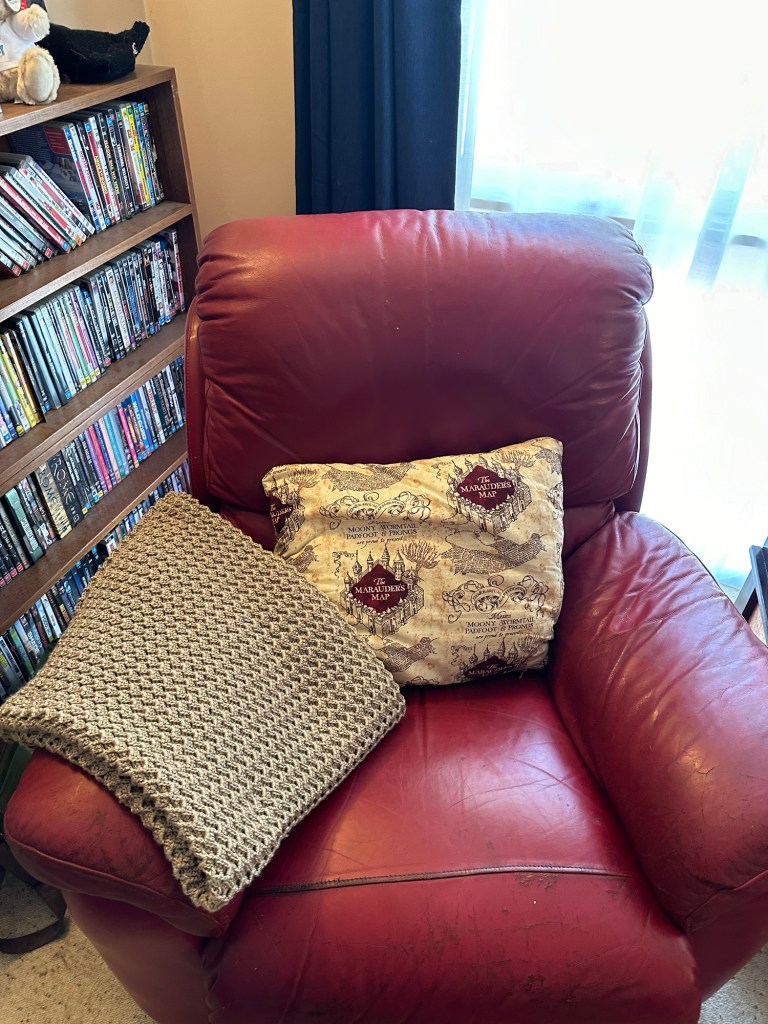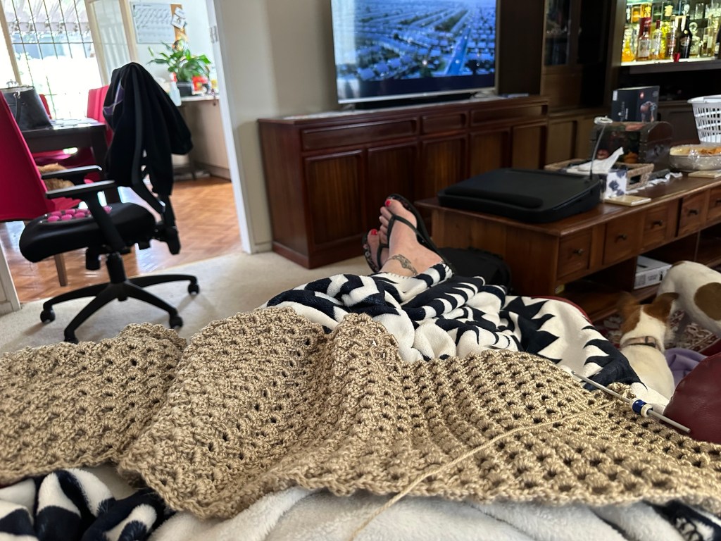 Last November, my husband started concurrent radiation and chemotherapy in preparation for stomach cancer surgery. For him, it meant sickness, discomfort, and an absolute need for calm and rest. I was talking to a beautiful friend of mine who is my declutter muse and queen of all that’s craft. She gave me a desire to retry learning the art of crochet and I decided to attempt a lap blanket for my husband. She sent me a YouTube link and I spent the next 76 days during chemotherapy visits, radiation visits, exercise physiology visits, and a ten-day stay in hospital post surgery donating my time to a gorgeous, textured baby blanket altered in size to become a hubby recovery lap blanket.