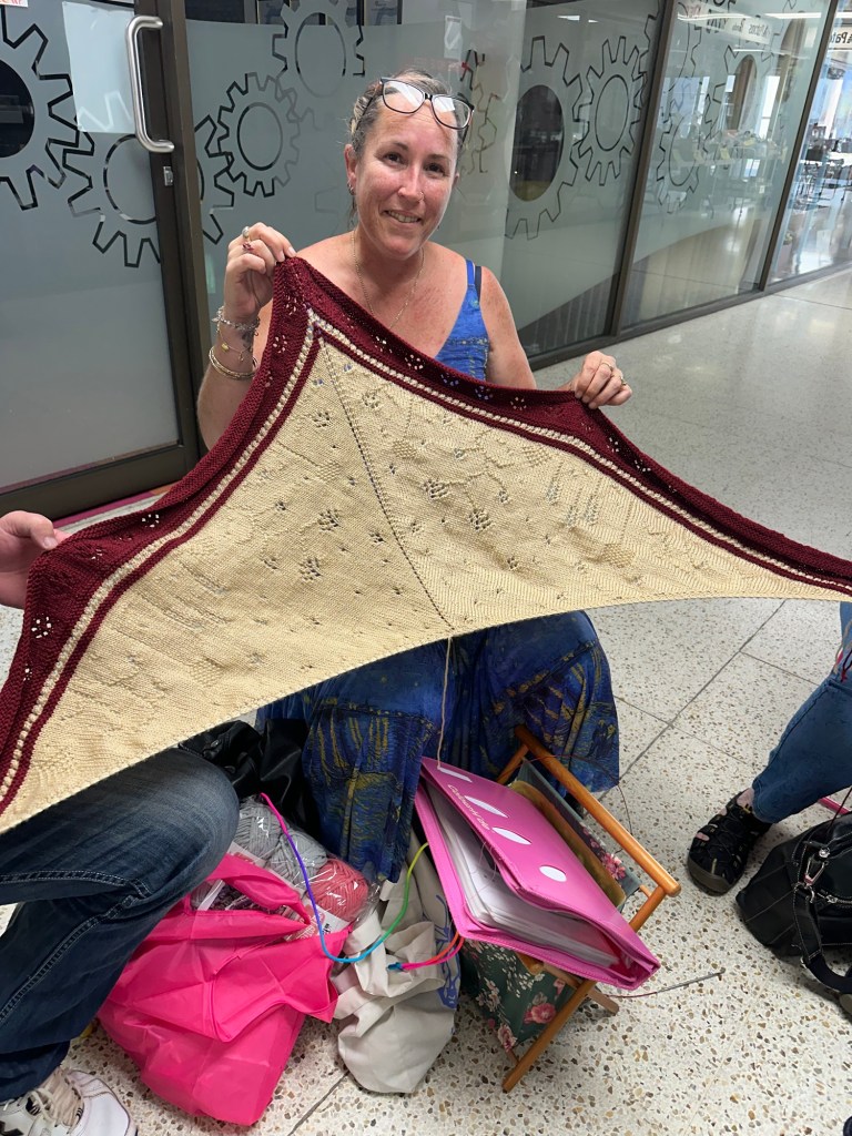 Before I could finish my cardigan, a gorgeous lady from knitting invited me to her church and shared a an email from an English church for a communal knit pattern. I started with the Lent knit-a-long shawl with some beautiful lace design and finished it on World Yarn Shop Day in Penrith, NSW.
