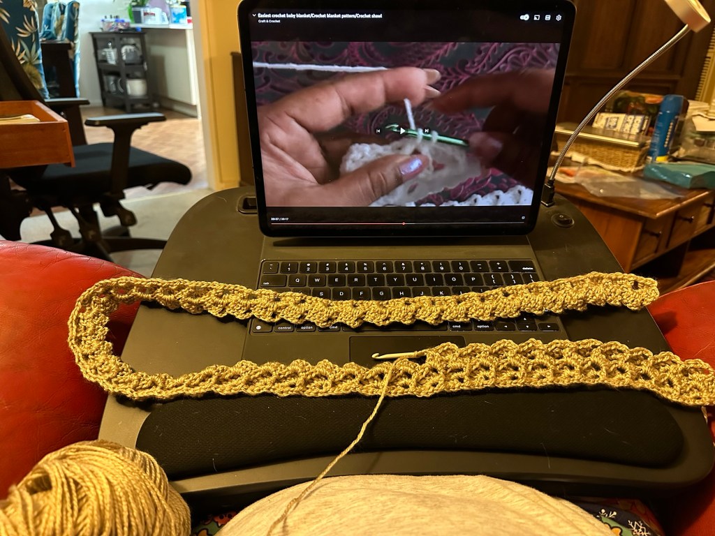 In November of 2023, I decided I wanted to learn how to crochet. I repurposed the wool from the vest and turned it into a textured blanket for Steve’s lap. My friend sent me a youtube video and I watched it in slow motion to teach myself the art. My daughter and I also joined a knitting circle and we would take time out for a couple of hours a week to be around other knitters and crocheters.