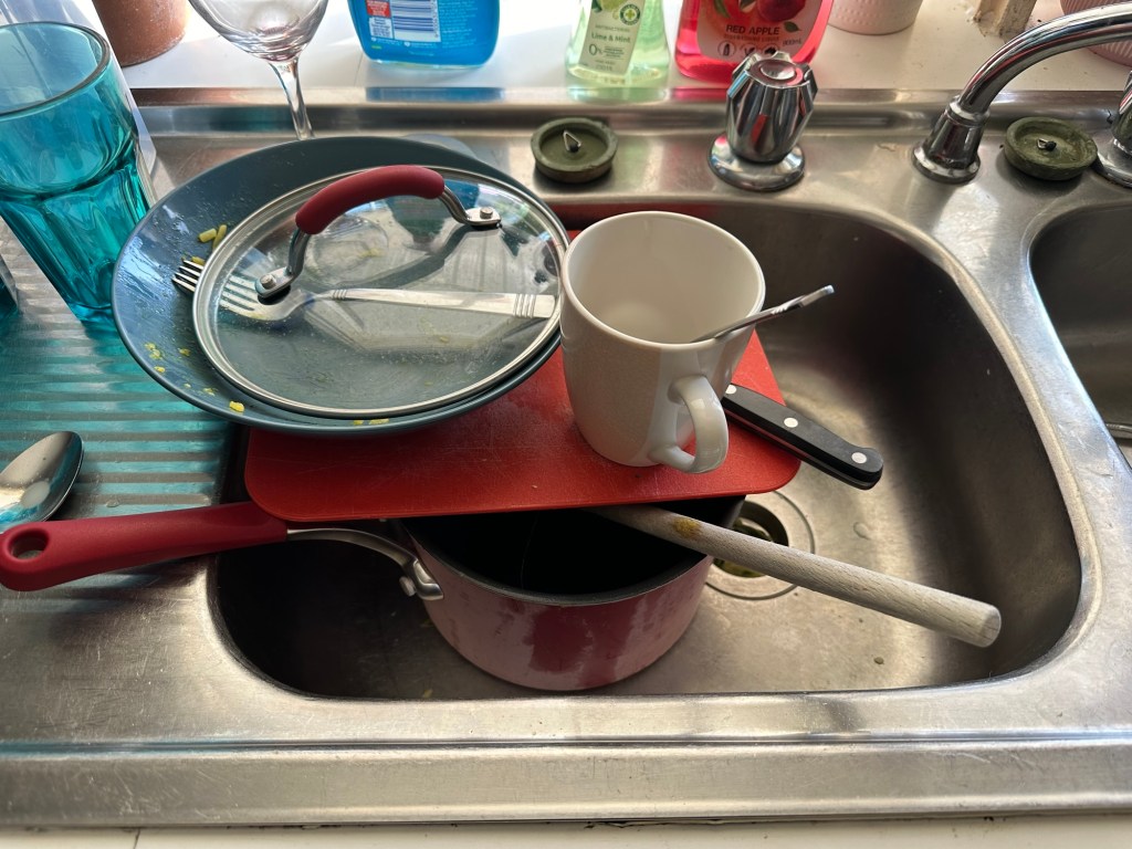 If you see dishes in my sink, this is a criminal activity in my house. The logic behind it is I cannot wash dishes in the sink if the sink is full. If they’re on the side, the sink can be filled with soapy warm water and I can wash them with ease. I will make a child clean the entire kitchen by themselves if I find my sink in this state.